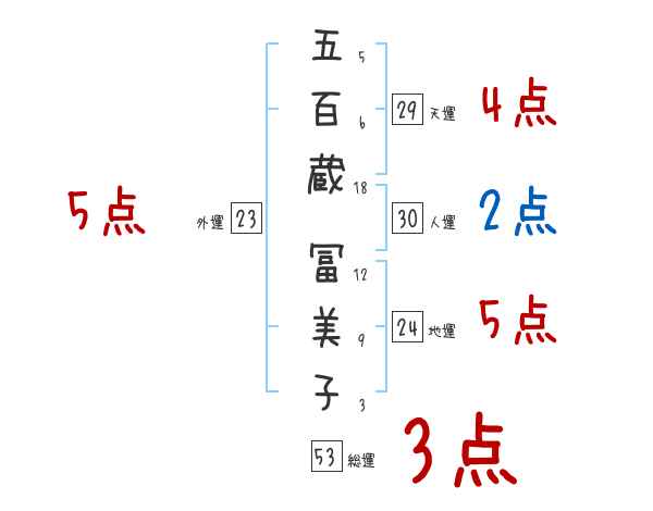 総運![]() | 五百蔵冨美子さんの総運は53画の3つ星!やや見栄っ張りで虚栄心がある。散財に注意。 あなたの人生を表す1番重要な運勢です。生涯を通じて影響する総合運となり、主に50歳以降の晩年期に影響を及ぼします。 |