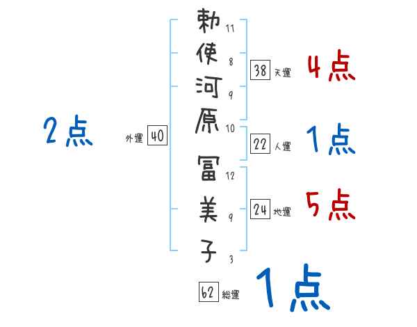 天運![]() | 勅使河原冨美子さんの天運は38画の4つ星!温厚な性格で技術的な才能を発揮する。職人的な仕事に向いている。 家系が持つ宿命的な運勢を表します。祖先から受け継いだ苗字ですので自分の力が及びません。家柄を象徴します。 |