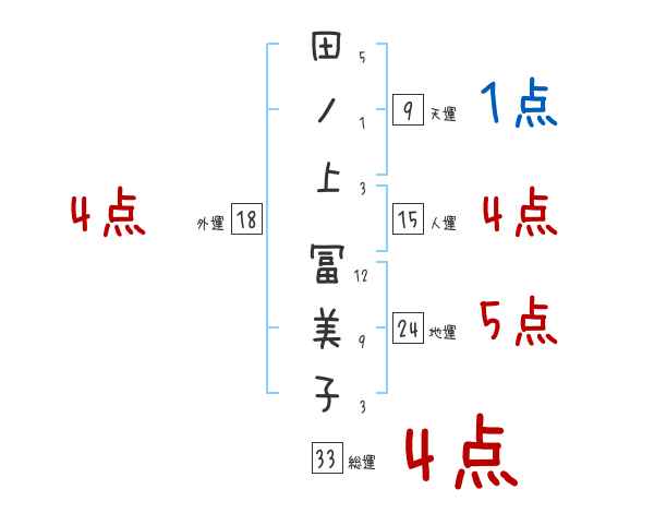 天運![]() | 田ノ上冨美子さんの天運は9画の1つ星!消極的で才能を発揮することが苦手なことも。周りの意見に耳を傾けましょう。 家系が持つ宿命的な運勢を表します。祖先から受け継いだ苗字ですので自分の力が及びません。家柄を象徴します。 |