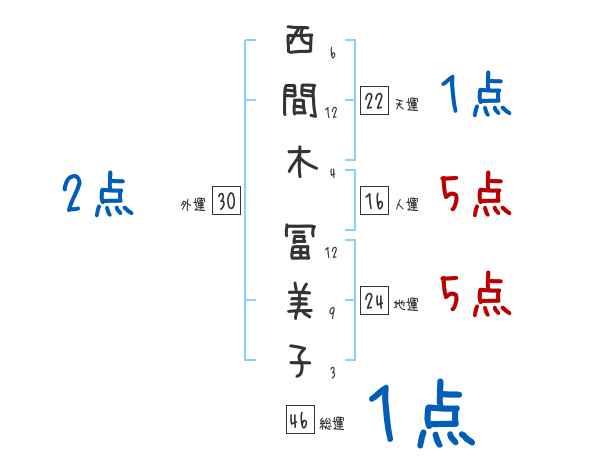 人運![]() | 西間木冨美子さんの人運は16画の5つ星!人望が厚く大きく発展する。逆転成功が見える。 性格や才能などを表す2番目に重要な運勢です。人間関係や協調性、社会的な成功に影響します。主に20歳から50歳ぐらいまでの中年期の運勢を表します。 |
