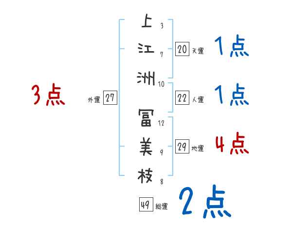 人運![]() | 上江洲冨美枝さんの人運は22画の1つ星!努力することが苦手ないっぽう手先が器用。芸術性にも優れる。 性格や才能などを表す2番目に重要な運勢です。人間関係や協調性、社会的な成功に影響します。主に20歳から50歳ぐらいまでの中年期の運勢を表します。 |