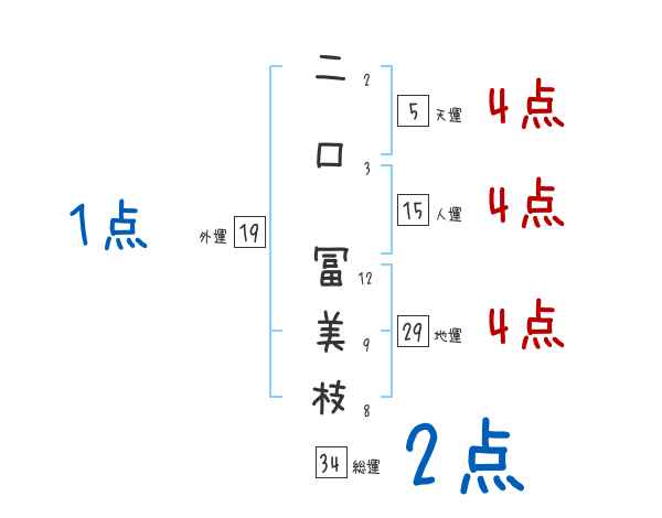 総運![]() | 二口冨美枝さんの総運は34画の2つ星!独創性に優れるが、自尊心が強く災難に注意しましょう。 あなたの人生を表す1番重要な運勢です。生涯を通じて影響する総合運となり、主に50歳以降の晩年期に影響を及ぼします。 |