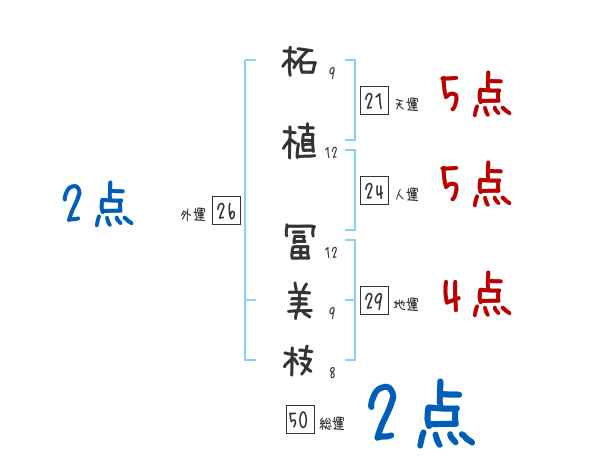 | 天運  | 柘植冨美枝さんの天運は21画の5つ星!統率力がある。独立し成功する。名誉を手に入れる。家系が持つ宿命的な運勢を表します。祖先から受け継いだ苗字ですので自分の力が及びません。家柄を象徴します。 |