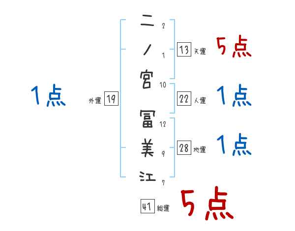 外運![]() | 二ノ宮冨美江さんの外運は19画の1つ星!優れた才能を持ちますが、協調性が足りないことも。周りの人と協力する事を意識しましょう。 生活面を象徴する運勢です。外部から受ける影響力を表し、結婚運、家庭運や職場、環境への順応性を表します。 |