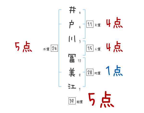 外運![]() | 井戸川冨美江さんの外運は24画の5つ星!家庭運が良く順調な人生。金運にも恵まれる。 生活面を象徴する運勢です。外部から受ける影響力を表し、結婚運、家庭運や職場、環境への順応性を表します。 |
