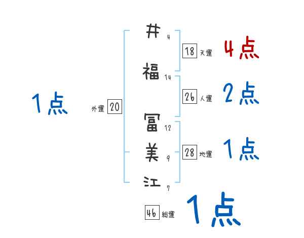 総運![]() | 井福冨美江さんの総運は46画の1つ星!迷走することが多く苦労するかも。目先のことにとらわれないように。 あなたの人生を表す1番重要な運勢です。生涯を通じて影響する総合運となり、主に50歳以降の晩年期に影響を及ぼします。 |