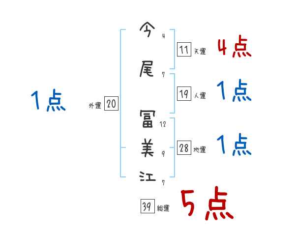 天運![]() | 今尾冨美江さんの天運は11画の4つ星!着実に富や地位を得る幸運な人生。 家系が持つ宿命的な運勢を表します。祖先から受け継いだ苗字ですので自分の力が及びません。家柄を象徴します。 |
