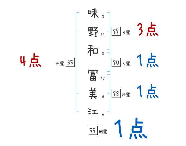 外運![]() | 味野和冨美江さんの外運は35画の4つ星!温厚な性格で感受性が高い。穏和な性格で人望が厚い。 生活面を象徴する運勢です。外部から受ける影響力を表し、結婚運、家庭運や職場、環境への順応性を表します。 |