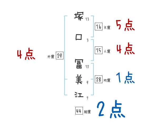 天運![]() | 塚口冨美江さんの天運は16画の5つ星!人望が厚く大きく発展する。逆転成功が見える。 家系が持つ宿命的な運勢を表します。祖先から受け継いだ苗字ですので自分の力が及びません。家柄を象徴します。 |