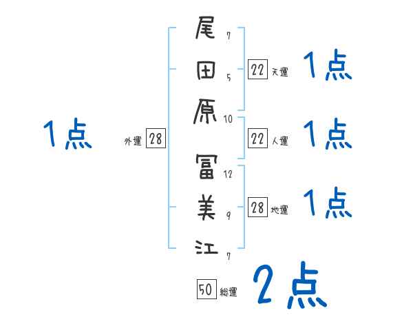外運![]() | 尾田原冨美江さんの外運は28画の1つ星!家庭環境に注意。スポーツで活躍できる能力があるかも。 生活面を象徴する運勢です。外部から受ける影響力を表し、結婚運、家庭運や職場、環境への順応性を表します。 |