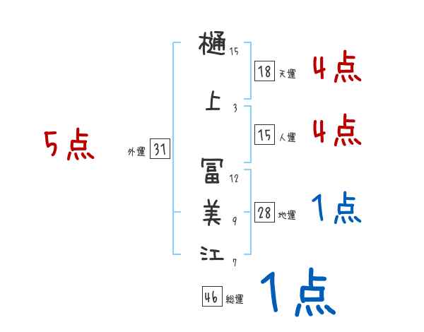 天運![]() | 樋上冨美江さんの天運は18画の4つ星!情熱的で剛気。忍耐力があり信頼される。 家系が持つ宿命的な運勢を表します。祖先から受け継いだ苗字ですので自分の力が及びません。家柄を象徴します。 |