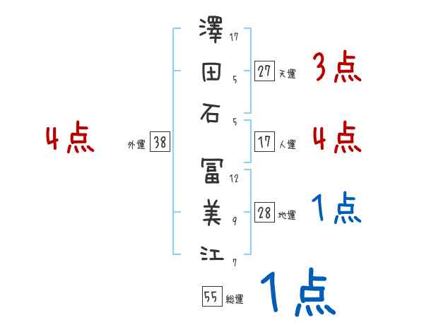 天運![]() | 澤田石冨美江さんの天運は27画の3つ星!頭脳明晰だが強情で摩擦が多い傾向。孤立に注意。 家系が持つ宿命的な運勢を表します。祖先から受け継いだ苗字ですので自分の力が及びません。家柄を象徴します。 |