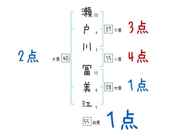 天運![]() | 瀬戸川冨美江さんの天運は27画の3つ星!頭脳明晰だが強情で摩擦が多い傾向。孤立に注意。 家系が持つ宿命的な運勢を表します。祖先から受け継いだ苗字ですので自分の力が及びません。家柄を象徴します。 |