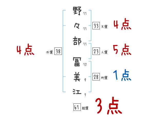 天運![]() | 野々部冨美江さんの天運は33画の4つ星!権力志向でプライドが高い。勇気があり運を切り開き成功する。 家系が持つ宿命的な運勢を表します。祖先から受け継いだ苗字ですので自分の力が及びません。家柄を象徴します。 |