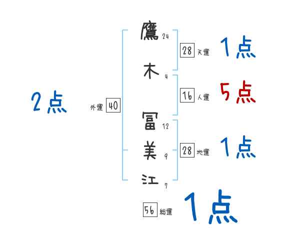 天運![]() | 鷹木冨美江さんの天運は28画の1つ星!家庭環境に注意。スポーツで活躍できる能力があるかも。 家系が持つ宿命的な運勢を表します。祖先から受け継いだ苗字ですので自分の力が及びません。家柄を象徴します。 |