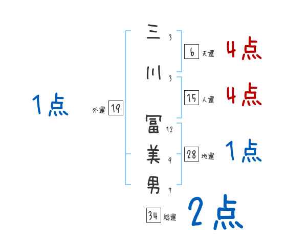 外運![]() | 三川冨美男さんの外運は19画の1つ星!優れた才能を持ちますが、協調性が足りないことも。周りの人と協力する事を意識しましょう。 生活面を象徴する運勢です。外部から受ける影響力を表し、結婚運、家庭運や職場、環境への順応性を表します。 |