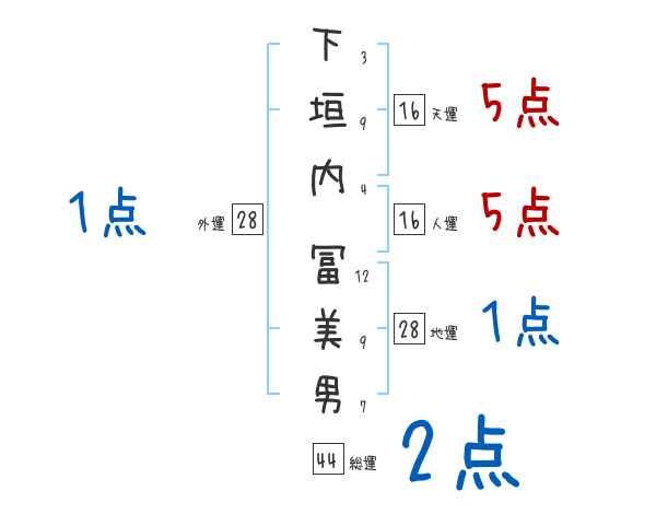 人運![]() | 下垣内冨美男さんの人運は16画の5つ星!人望が厚く大きく発展する。逆転成功が見える。 性格や才能などを表す2番目に重要な運勢です。人間関係や協調性、社会的な成功に影響します。主に20歳から50歳ぐらいまでの中年期の運勢を表します。 |