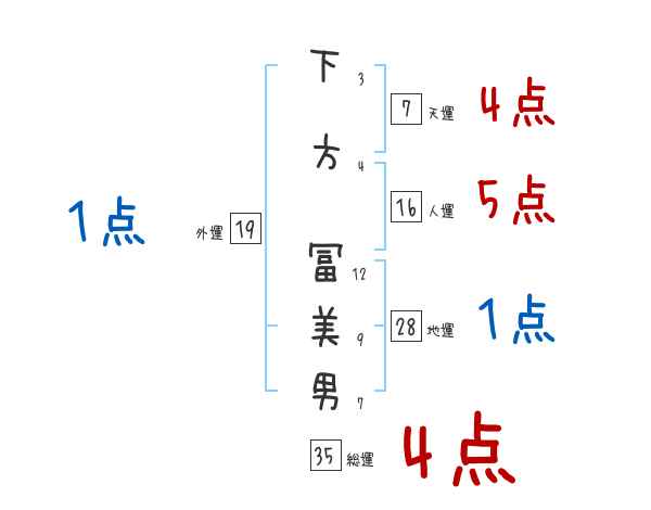 天運![]() | 下方冨美男さんの天運は7画の4つ星!強い意志や信念を持ち独立心が強い。自立する。 家系が持つ宿命的な運勢を表します。祖先から受け継いだ苗字ですので自分の力が及びません。家柄を象徴します。 |