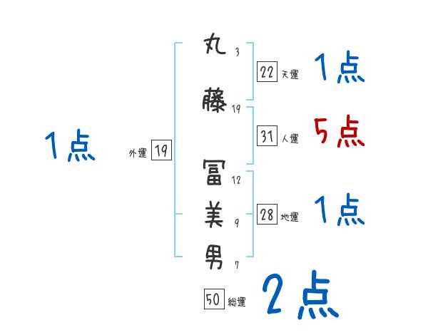 外運![]() | 丸藤冨美男さんの外運は19画の1つ星!優れた才能を持ちますが、協調性が足りないことも。周りの人と協力する事を意識しましょう。 生活面を象徴する運勢です。外部から受ける影響力を表し、結婚運、家庭運や職場、環境への順応性を表します。 |