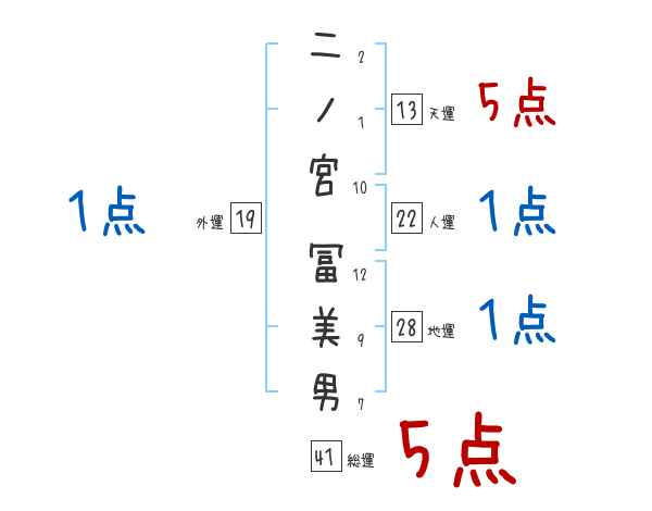 外運![]() | 二ノ宮冨美男さんの外運は19画の1つ星!優れた才能を持ちますが、協調性が足りないことも。周りの人と協力する事を意識しましょう。 生活面を象徴する運勢です。外部から受ける影響力を表し、結婚運、家庭運や職場、環境への順応性を表します。 |