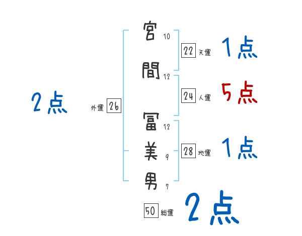 総運![]() | 宮間冨美男さんの総運は50画の2つ星!浮き沈みが激しく不安定。しりすぼみに衰退しやすいので注意しましょう。 あなたの人生を表す1番重要な運勢です。生涯を通じて影響する総合運となり、主に50歳以降の晩年期に影響を及ぼします。 |