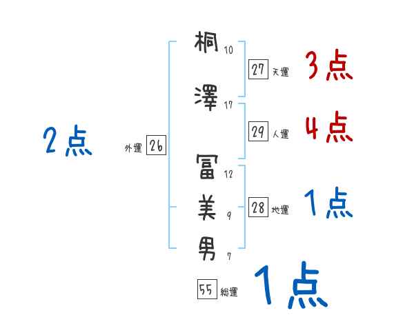 外運![]() | 桐澤冨美男さんの外運は26画の2つ星!波瀾万丈かも。信頼できる人を大事にしましょう。 生活面を象徴する運勢です。外部から受ける影響力を表し、結婚運、家庭運や職場、環境への順応性を表します。 |