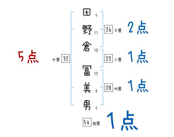 外運![]() | 田野倉冨美男さんの外運は32画の5つ星!柔軟性があり成功する。チャンスが多く金運が良い。 生活面を象徴する運勢です。外部から受ける影響力を表し、結婚運、家庭運や職場、環境への順応性を表します。 |