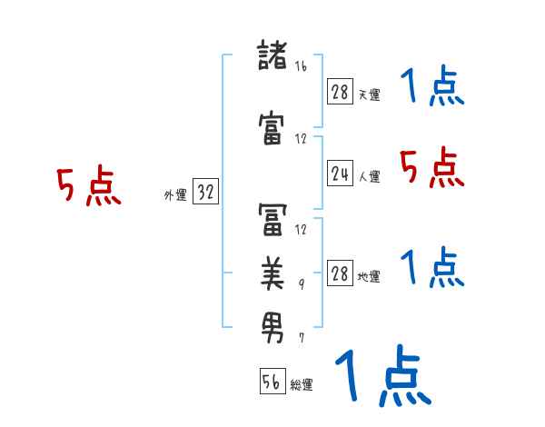 天運![]() | 諸富冨美男さんの天運は28画の1つ星!家庭環境に注意。スポーツで活躍できる能力があるかも。 家系が持つ宿命的な運勢を表します。祖先から受け継いだ苗字ですので自分の力が及びません。家柄を象徴します。 |