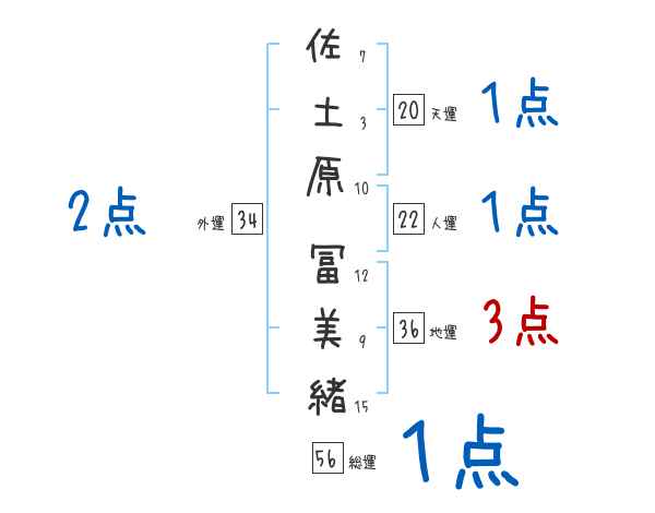 外運![]() | 佐土原冨美緒さんの外運は34画の2つ星!独創性に優れるが、自尊心が強く災難に注意しましょう。 生活面を象徴する運勢です。外部から受ける影響力を表し、結婚運、家庭運や職場、環境への順応性を表します。 |