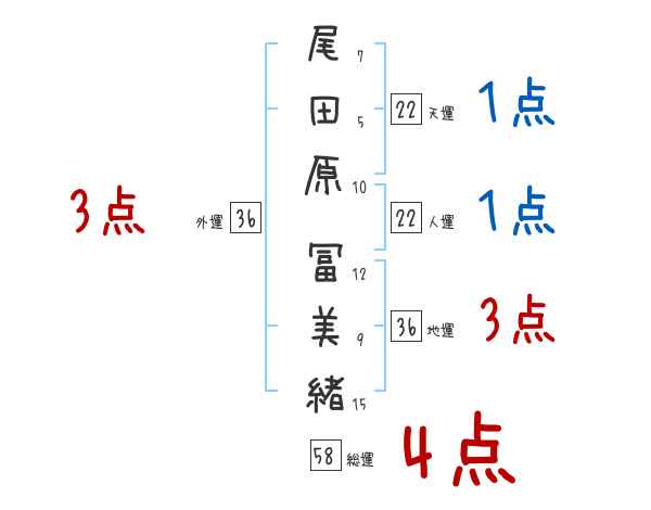 外運![]() | 尾田原冨美緒さんの外運は36画の3つ星!先見性が豊かです。多少神経質で苦労することも。 生活面を象徴する運勢です。外部から受ける影響力を表し、結婚運、家庭運や職場、環境への順応性を表します。 |