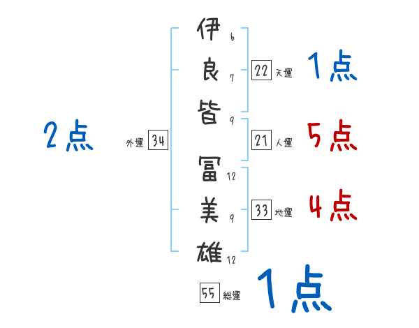 人運![]() | 伊良皆冨美雄さんの人運は21画の5つ星!統率力がある。独立し成功する。名誉を手に入れる。 性格や才能などを表す2番目に重要な運勢です。人間関係や協調性、社会的な成功に影響します。主に20歳から50歳ぐらいまでの中年期の運勢を表します。 |