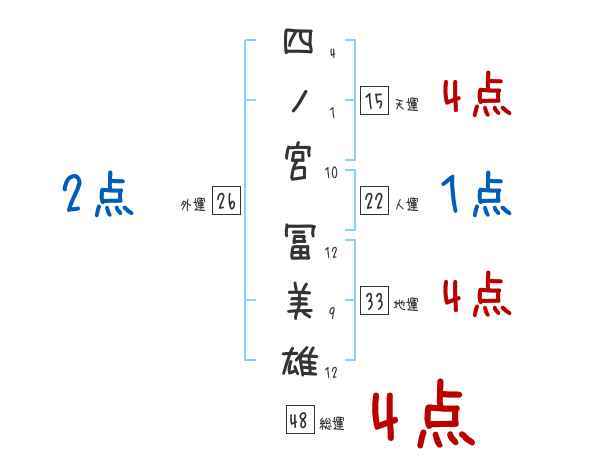 総運![]() | 四ノ宮冨美雄さんの総運は48画の4つ星!賢明な性格で人望が厚い。指導力があり多くの人に尊敬される。 あなたの人生を表す1番重要な運勢です。生涯を通じて影響する総合運となり、主に50歳以降の晩年期に影響を及ぼします。 |