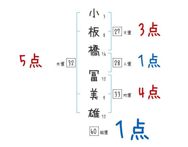 外運![]() | 小板橋冨美雄さんの外運は32画の5つ星!柔軟性があり成功する。チャンスが多く金運が良い。 生活面を象徴する運勢です。外部から受ける影響力を表し、結婚運、家庭運や職場、環境への順応性を表します。 |