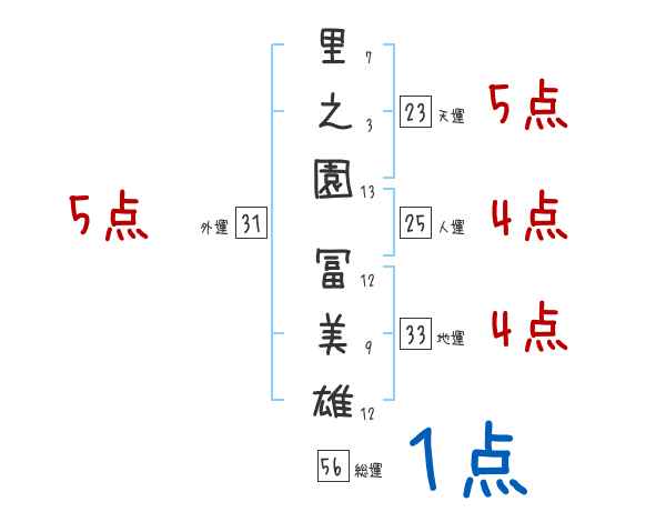 天運![]() | 里之園冨美雄さんの天運は23画の5つ星!想像力に優れ活力がある。一代で成功し名誉を手に入れる。 家系が持つ宿命的な運勢を表します。祖先から受け継いだ苗字ですので自分の力が及びません。家柄を象徴します。 |