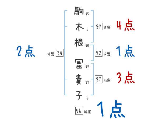 天運![]() | 駒木根冨貴子さんの天運は29画の4つ星!完全主義で才能がある。厳格な心の持ち主。 家系が持つ宿命的な運勢を表します。祖先から受け継いだ苗字ですので自分の力が及びません。家柄を象徴します。 |