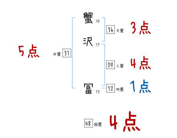 天運![]() | 蟹沢冨さんの天運は36画の3つ星!先見性が豊かです。多少神経質で苦労することも。 家系が持つ宿命的な運勢を表します。祖先から受け継いだ苗字ですので自分の力が及びません。家柄を象徴します。 |
