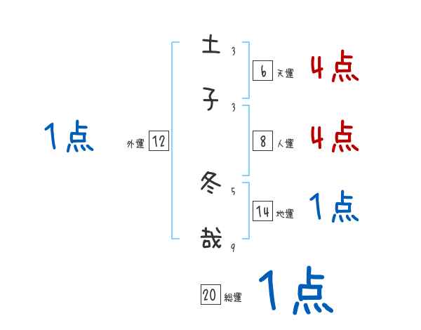 天運![]() | 土子冬哉さんの天運は6画の4つ星!慎重な努力家で信頼を得る。誠実な精神で向上心に優れる。 家系が持つ宿命的な運勢を表します。祖先から受け継いだ苗字ですので自分の力が及びません。家柄を象徴します。 |
