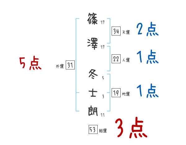 総運![]() | 篠澤冬士朗さんの総運は53画の3つ星!やや見栄っ張りで虚栄心がある。散財に注意。 あなたの人生を表す1番重要な運勢です。生涯を通じて影響する総合運となり、主に50歳以降の晩年期に影響を及ぼします。 |