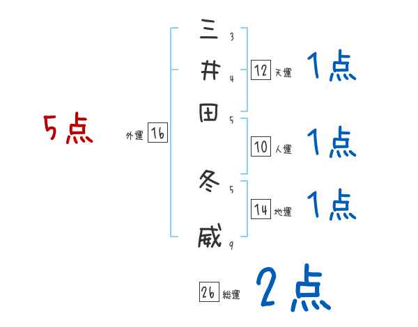 天運![]() | 三井田冬威さんの天運は12画の1つ星!簡単な失敗で諦めてしまいやすいかも。着実に行動すると良いでしょう。 家系が持つ宿命的な運勢を表します。祖先から受け継いだ苗字ですので自分の力が及びません。家柄を象徴します。 |