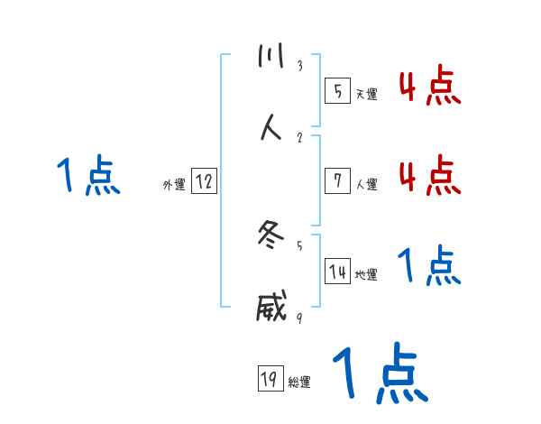 総運![]() | 川人冬威さんの総運は19画の1つ星!優れた才能を持ちますが、協調性が足りないことも。周りの人と協力する事を意識しましょう。 あなたの人生を表す1番重要な運勢です。生涯を通じて影響する総合運となり、主に50歳以降の晩年期に影響を及ぼします。 |