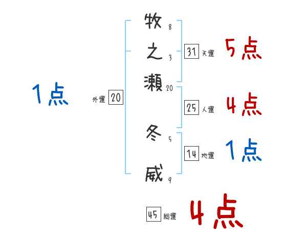 総運![]() | 牧之瀬冬威さんの総運は45画の4つ星!もくもくと物事を進め達成する。地味な努力家。 あなたの人生を表す1番重要な運勢です。生涯を通じて影響する総合運となり、主に50歳以降の晩年期に影響を及ぼします。 |