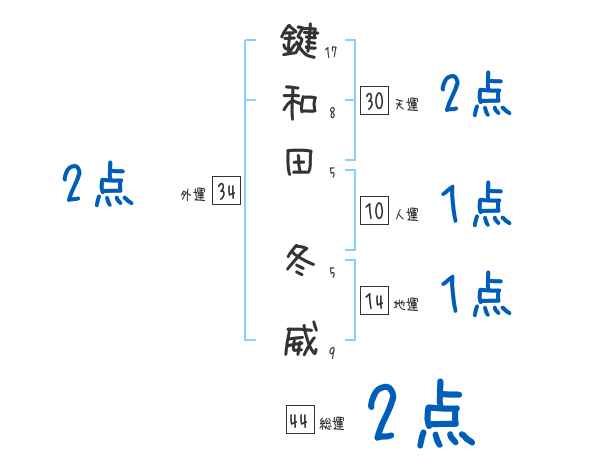 総運![]() | 鍵和田冬威さんの総運は44画の2つ星!誠実で慎重な性格。物事を考えすぎないように注意しましょう。 あなたの人生を表す1番重要な運勢です。生涯を通じて影響する総合運となり、主に50歳以降の晩年期に影響を及ぼします。 |