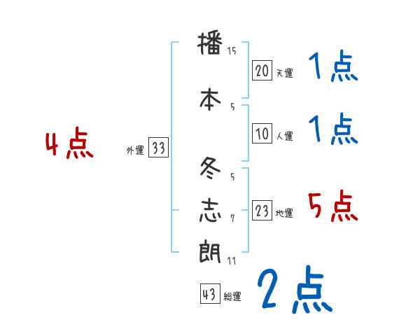 外運![]() | 播本冬志朗さんの外運は33画の4つ星!権力志向でプライドが高い。勇気があり運を切り開き成功する。 生活面を象徴する運勢です。外部から受ける影響力を表し、結婚運、家庭運や職場、環境への順応性を表します。 |