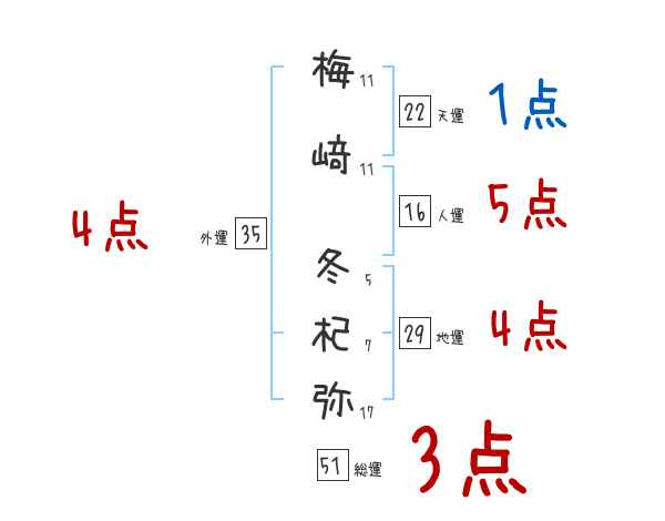 外運![]() | 梅﨑冬杞弥さんの外運は35画の4つ星!温厚な性格で感受性が高い。穏和な性格で人望が厚い。 生活面を象徴する運勢です。外部から受ける影響力を表し、結婚運、家庭運や職場、環境への順応性を表します。 |
