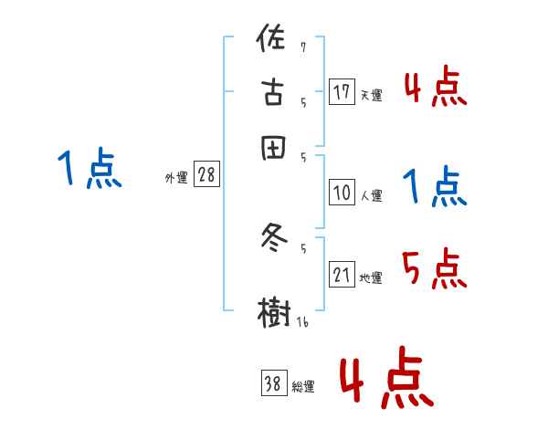 天運![]() | 佐古田冬樹さんの天運は17画の4つ星!積極的な行動力。地位を気づき財産を手に入れる。純粋な心と直感力。 家系が持つ宿命的な運勢を表します。祖先から受け継いだ苗字ですので自分の力が及びません。家柄を象徴します。 |