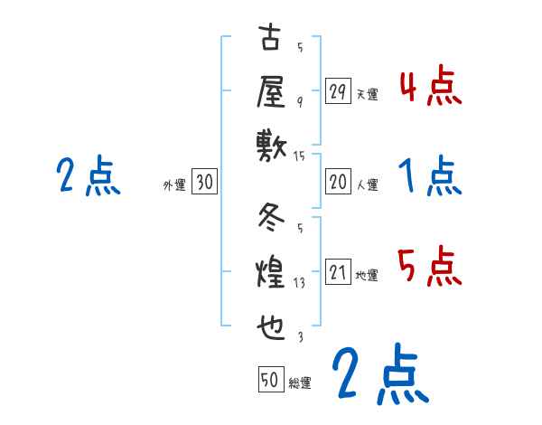 天運![]() | 古屋敷冬煌也さんの天運は29画の4つ星!完全主義で才能がある。厳格な心の持ち主。 家系が持つ宿命的な運勢を表します。祖先から受け継いだ苗字ですので自分の力が及びません。家柄を象徴します。 |