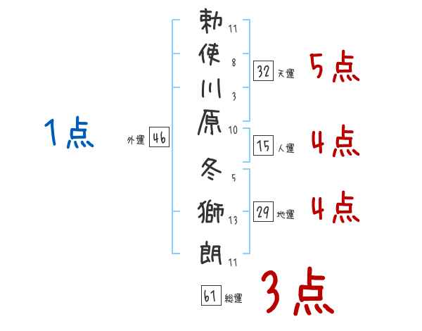 天運![]() | 勅使川原冬獅朗さんの天運は32画の5つ星!柔軟性があり成功する。チャンスが多く金運が良い。 家系が持つ宿命的な運勢を表します。祖先から受け継いだ苗字ですので自分の力が及びません。家柄を象徴します。 |