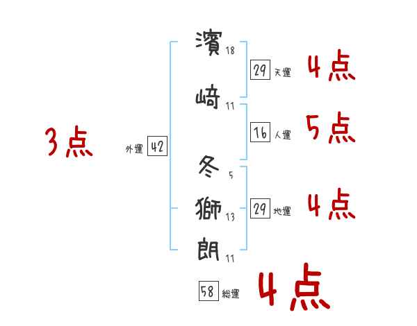 総運![]() | 濱﨑冬獅朗さんの総運は58画の4つ星!安定した生活。大器晩成タイプ。 あなたの人生を表す1番重要な運勢です。生涯を通じて影響する総合運となり、主に50歳以降の晩年期に影響を及ぼします。 |