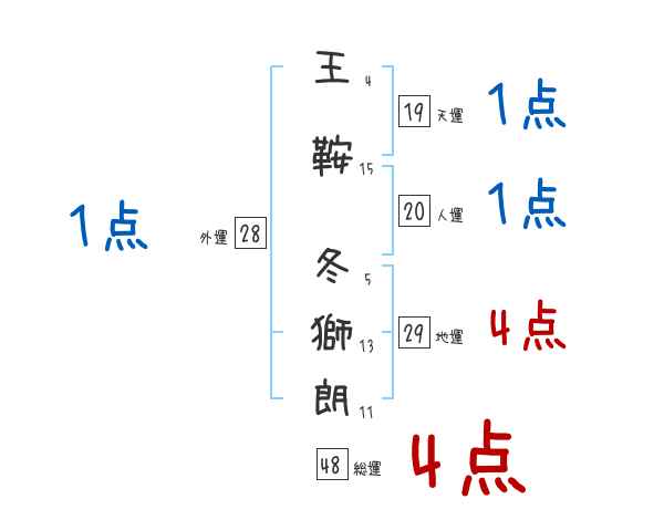 外運![]() | 王鞍冬獅朗さんの外運は28画の1つ星!家庭環境に注意。スポーツで活躍できる能力があるかも。 生活面を象徴する運勢です。外部から受ける影響力を表し、結婚運、家庭運や職場、環境への順応性を表します。 |