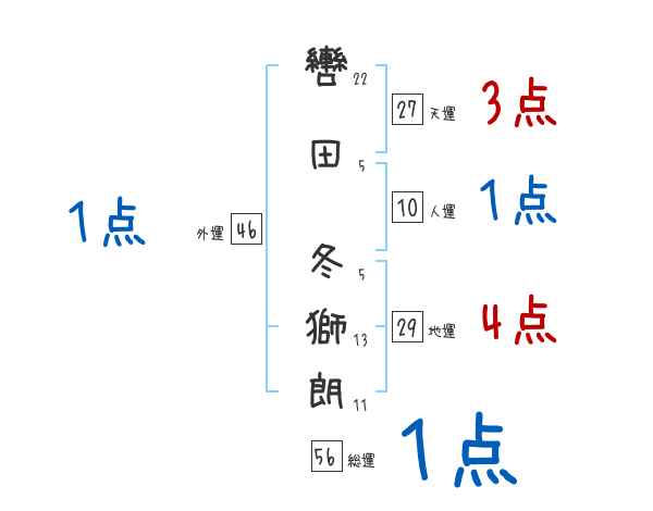 地運![]() | 轡田冬獅朗さんの地運は29画の4つ星!完全主義で才能がある。厳格な心の持ち主。 個性を表す基礎的な運勢です。性格形成や対人関係、行動力など家庭環境に影響されます。主に誕生してから20歳くらいまでの若年期の運勢を表します。 |